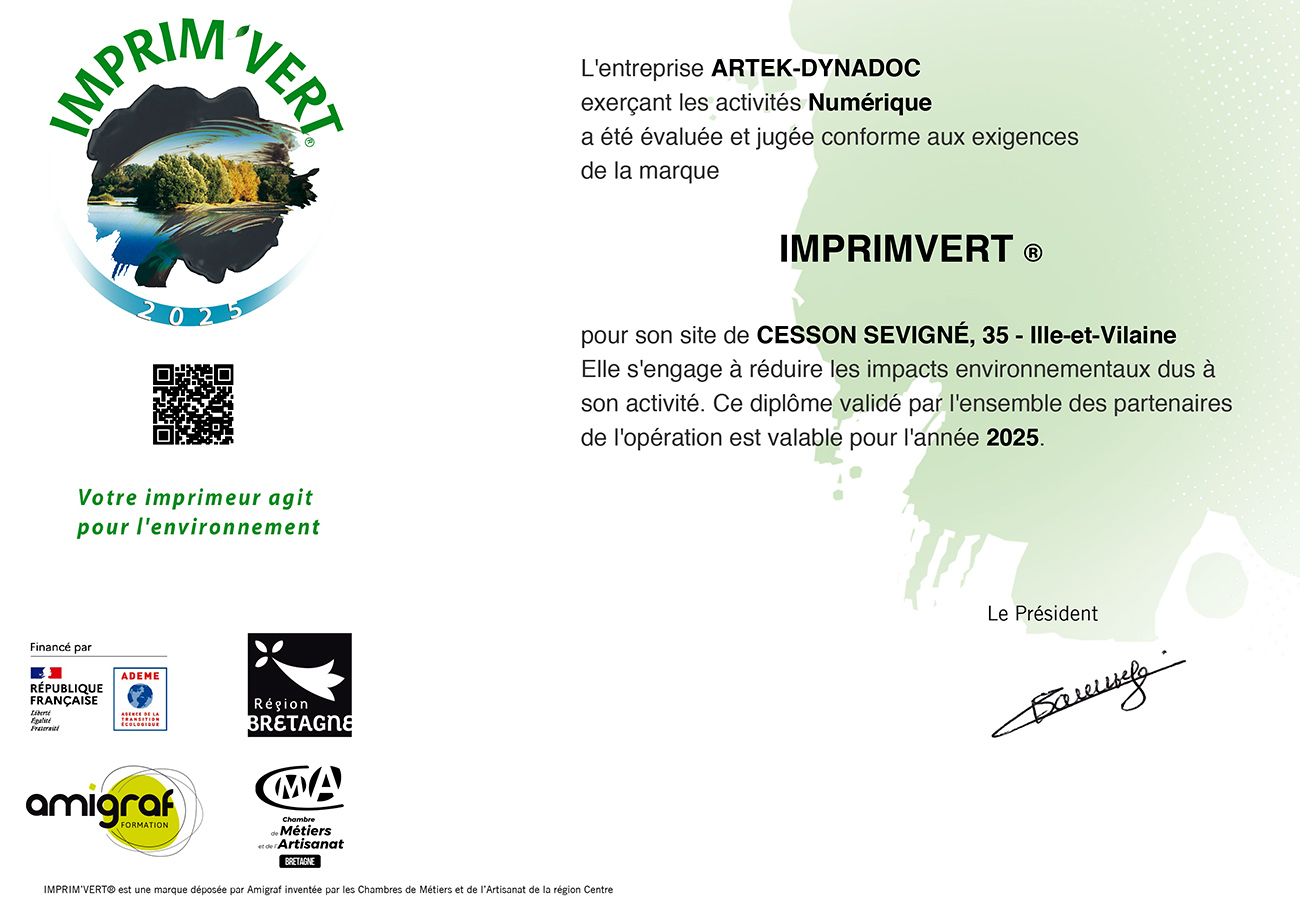 # ARTEK Dynadoc obtient de nouveau sa certification Imprim'Vert® !